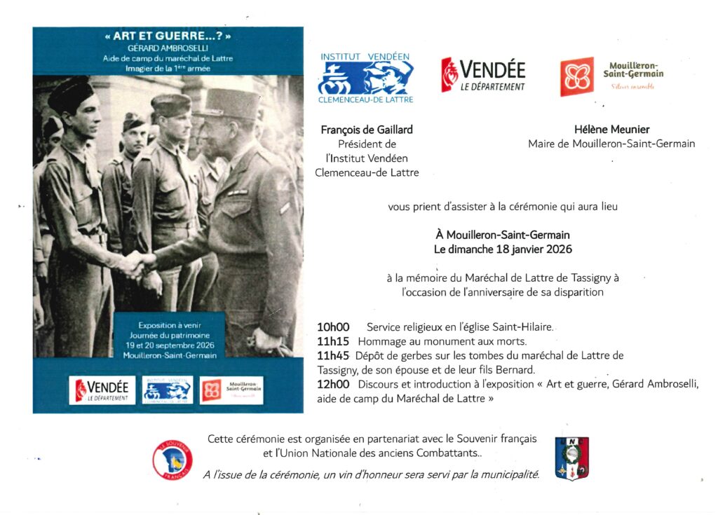 INVITATION : Cérémonie d’hommage au Maréchal Jean de Lattre de Tassigny à l’occasion du 74ème anniversaire de sa disparition